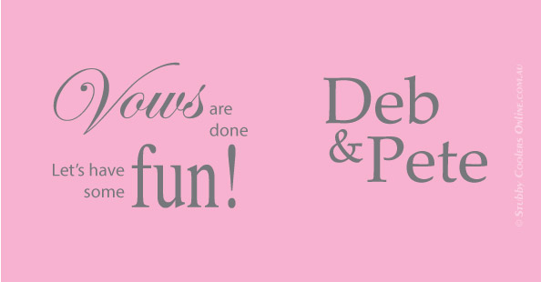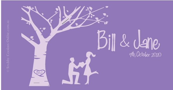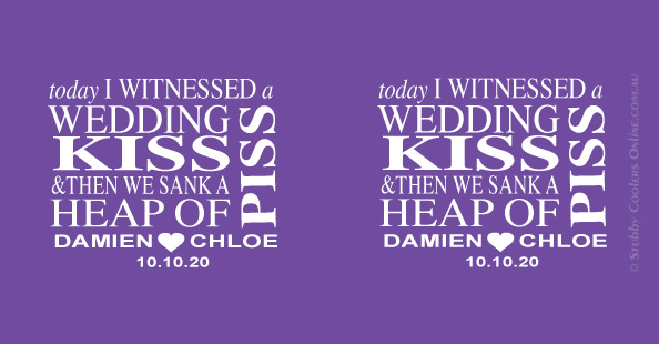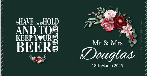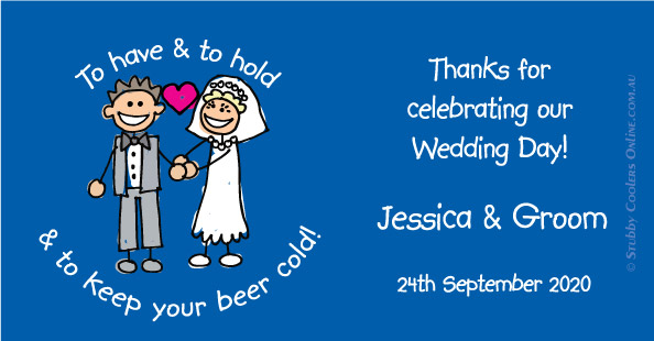 We have a huge selection of Wedding Cooler designs which you can use as is or just change the names, date and add a place, you can even combine elements from two or three designs or we can create for you an individual custom design for your wedding favours and personalised wedding stubbie holders.